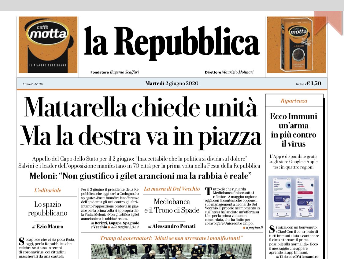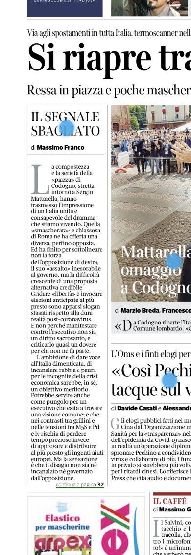 Mette in contrasto “la compostezza e la serietà della «piazza» di Codogno, stretta intorno a Sergio Mattarella” che “, ha trasmesso l’impressione di un’Italia unita”, con quella “mascherata e chiassosa della opposizione di destra”. Questa destra, facendo opposizione e mostrandi di poter unire la piazza (“Assembramento! Polizia!”) ha dato “Il segnale sbagliato”: ossia non quello che si attendeva il Colle e giù giù la Corte Costituzionale, la Palamara e gli Scenziati. Ciò ha finito per manifestare non la forza della destra, ma la sua incapacità di fornire “una proposta alternativa”… e via così: siete deboli, siete “negazionisti” della pandemia e la riportate, – chiedendo nuove elezioni siete contro l'”unità”. Saranno presi provvedimento contro di voi. Sanitari, ovvimente.