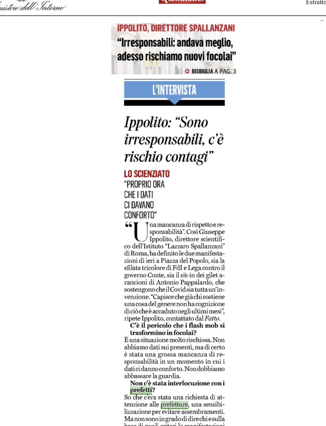 Si dà voce allo “scienziato Ippolito” che minaccia: “sono irresponsabili, c’è il rischio di contagi. Proprio adesso che i dati ci davano conforto”.