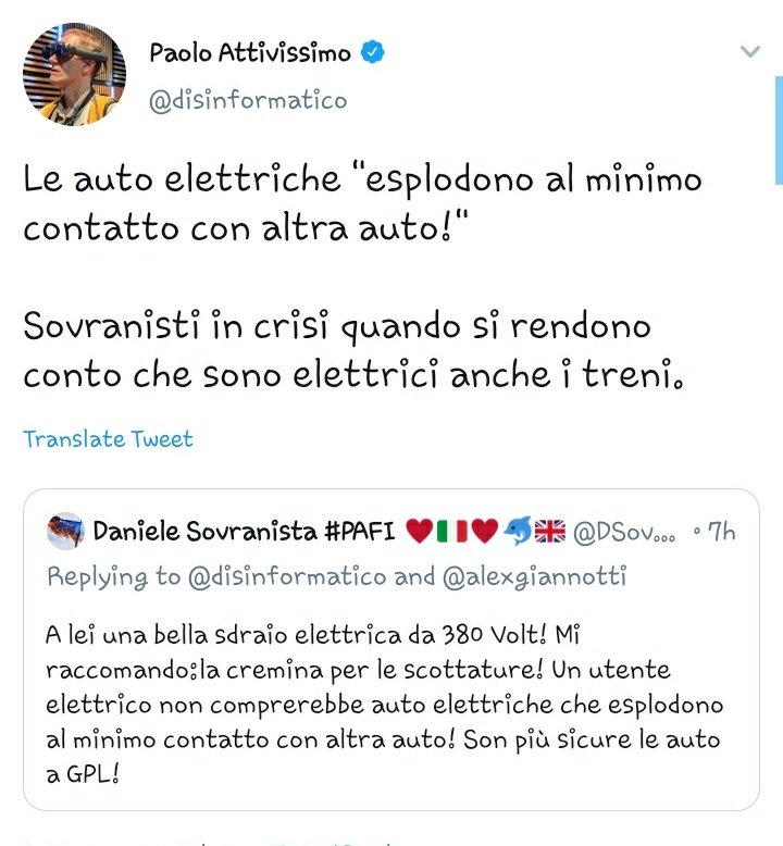 Da cui si capisce che non sa nulla del motore elettrico e del suo problema, che sono le batterie per la ricarica; e ha anche scoperto solo recentemente che i treni “sono elettrici”, e lo comunica godendo ai “sovranisti in crisi”: supponendo che “quelli che si oppongono al progresso elettrico (come lo capisce lui) siano “sovranisti” .