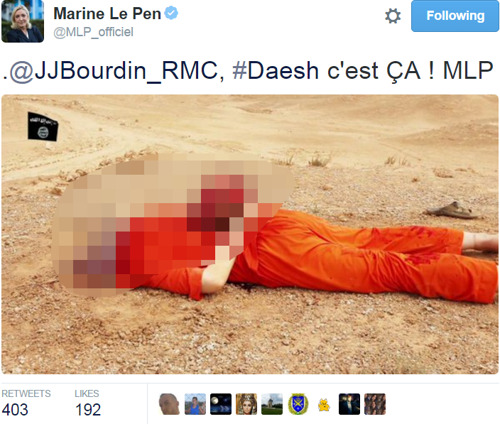Saprete anche perché Marine Le Pen ha pubblicato le foto delle decapitazioni con la scritta: DAESH è Questo! Ciò, perché era stata provocata: il 16 dicembre 2015, alla radio RMC, avevano paragonato l’ascesa del Front National a DAESH; dunque rispondeva a questa provocazione offensiva quanto demente.