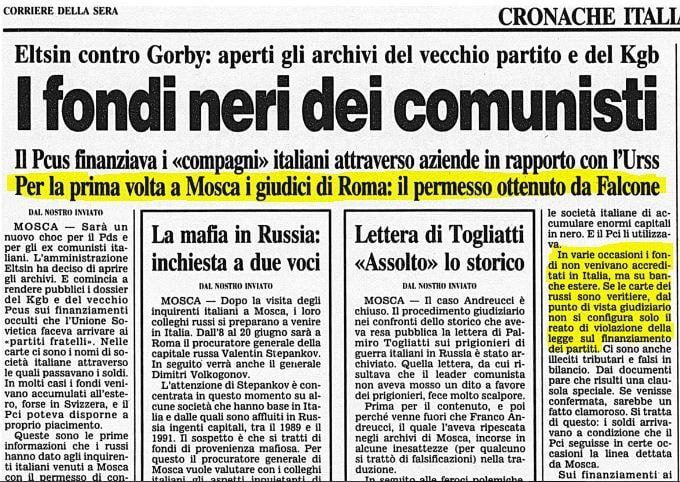 A pagina 19 del Corriere della Sera del 4 giugno 1992 è sepolta, ben nascosta agli occhi dell’opinione pubblica di allora e di oggi, la verità sulla strage di Capaci. Falcone era stato ucciso barbaramente da 11 giorni. Quel giorno vennero a Roma i magistrati russi per fare luce sui fondi neri del PCUS transitati nel PCI. Marco Nese scriveva questo al riguardo dell’inchiesta.