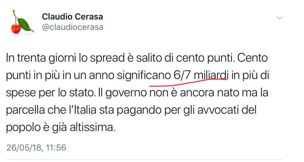 E’ la stessa mezogna che stano ripetendo in queste ore le radio e i giornali liberisti e libertari, dal Corriere a Radio Radicale. E’ menzogna che un lieve e momentaneo aumento dello spread (che oggi, Draghi farà scendere per mostrare che Cottarelli ci salva) si traduca in un aggravio diretto della spesa pubblica. E’ una menzogna non solo senza fondamento, ma configura i reati di aggiotaggio e manipolazione del mercato.