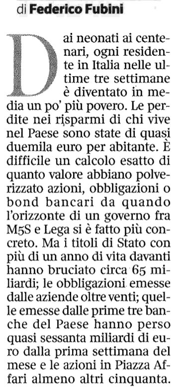 Stavo dimenticando: Federico Fubini, sul Corriere, il più deciso a diffondere il panico e fake news sul governo 5Stelle-Lega, “Faremo la fine dell’Argentina”, pagheremo di più il muto, eccetera: