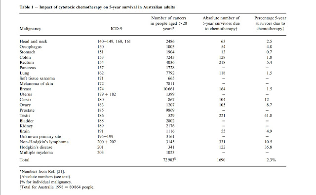 Infatti. E la prova è nella monumentale indagine clinica condotta da Dal Dipartimento di Oncologia Radiologica del Northern Sidney Cancer Center e pubblicato sul Journal of Clinical Oncology il dicembre 2004. E’ intitolato: “The Contribution of Cytotoxic Chemotherapy to 5-year Survival in Adult Malignancies”, ossia: Il contributo della terapia citotossica alla sopravvivenza nei cinque anni nei tumori maligni di adulti”.