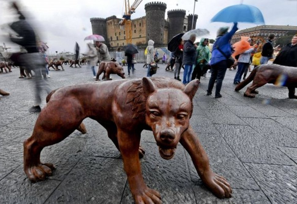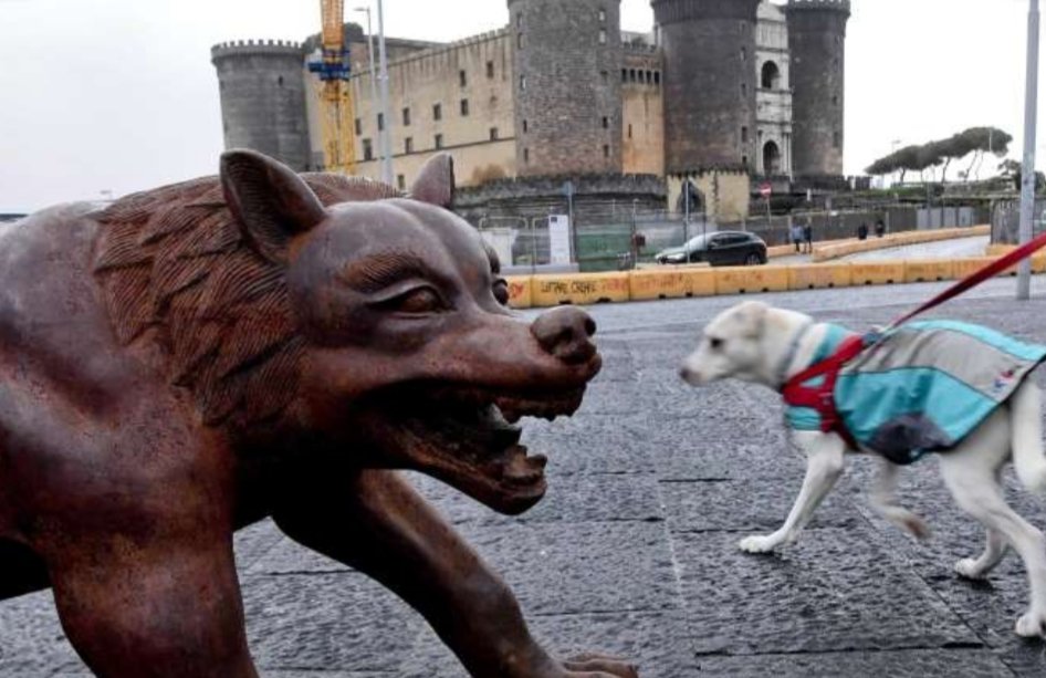 A Napoli dove al comune mancano i fondi per qualunque opera utile alla cittadinanza, il sindaco De Magistri ha trovato i quattrini per questa costosa “Installazione” pre-natalizia: cento cani idrofobi in ferro, digrignanti, opera di un cinese, Wang Rowang, “perseguitato dl regime”, in piazza del municipio.