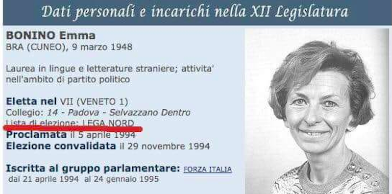 Nel 1994, ad Emma Bonino i voti della Lega non facevano schifo. Era la Lega stupida di Bossi e furbastra di Maroni (e del Trota), quelle dell’acqua del Po e dei militanti con le corna da vichingo, secessionista, anti-meridionale (a parole), derisa dalle sinistre illuminate: ma la Bonino si fa eleggere da quella formazione. La cui rozzezza permetteva ogni forma di “entrismo”.