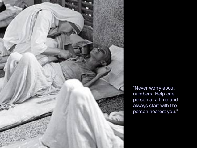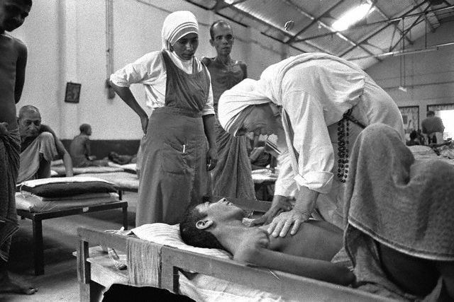 Il suo “dubbio modo di curare i malati”? Ma Madre Teresa non curava i malati, non fondò ospedali e non era quella la sua intenzione; all’inizio, dedita ai “più poveri fra i poveri”, ne trovava fra la spazzatura di Calcutta, deformi, divorati dagli insetti, dementi, affamati e morenti abbandonati – e li portava in un locale nell’angolo del tempio di Kalì. Li lavava, li nutriva e li faceva sentire amati, vegliava la loro agonia accarezzandoli. Una vecchia disse: “Sono vissuta come una bestia e ora muoio come un angelo”.
