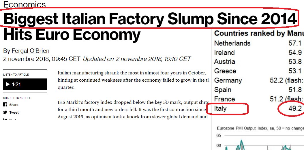 1) “In Germania le prospettive di crescita stanno peggiorando. Le previsioni di crescita del terzo quadrimestre sono a ZERO; ora solo 1,6 per 2018, ha tagliato 2019 previsione di crescita a 1.3 i da 1.7” https://twitter.com/Schuldensuehner/status/1058973368030965760