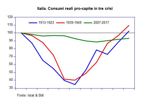 Il suo grafico mostra che dopo la Grande Guerra, per tornare al livello dei consumi di prima del conflitto l’Italia ci ha messo un cinque anni; idem dopo la seconda guerra mondiale, anzi meno: in fatto di Pil, avevamo recuperato quello anteguerra già nel 1948. Nella nostra crisi attuale, non siamo ancora tornati ai consumi pre-2008. Anche dopo la crisi del 1929, il recupero è stato più rapido di oggi: