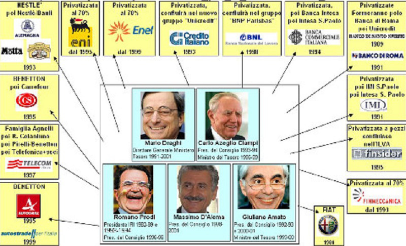 Con la vendita della Nuovo Pignone (invano i sindacati andarono in ginocchio da Ciampi ad implorarlo di non farlo), mi fu chiaro che il “venerato maestro” (venerato dai media), il grande “tecnico banchiere” e futuro presidente della repubblica tanto umano, era un traditore della patria. Perché, se è chiaro che Ciampi stava eseguendo delle istruzioni ricevute (di economia non ha mai capito nulla, non esiste un solo studio scientifico a sua firma), poteva anche sì ritenere che privatizzare fosse suo dovere verso i “mercati”: ma che vendesse deliberatamente e sistematicamente in perdita, perché? Nel settembre 1993, Ciampi vendette a Nestlé e Unilever e a un italiano che sta in Svizzera, le aziende alimentari dell’IRI-SME , per 750 miliardi: mentre il gruppo aveva un fatturato di 3 mila miliardi. La privatizzazione delle tra grandi banche pubbliche, che tolse allo Stato ogni potere sul credito, avvenne alle stesse condizioni; e così la siderurgia, le assicurazioni, le privatizzazioni del gruppo ENI, la telefonia, l’elettricità.