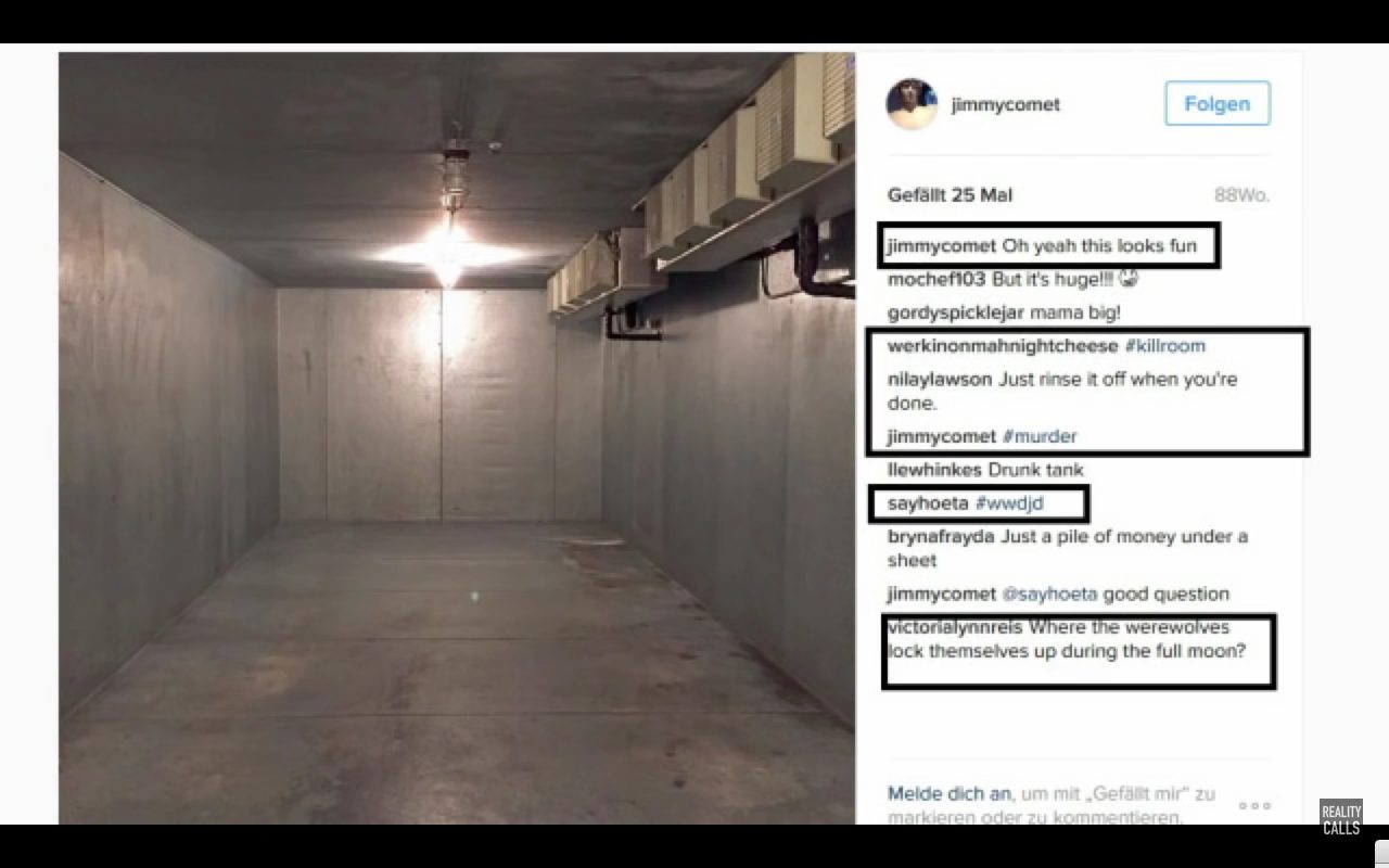 Come si ricorderà, Alefantis (con lo pseudonimo “Jimmy Comet”) in uno dei messaggi twitter, mostrava ai suoi “amici” una stanza sotterranea senza finestre. E gli amici, si congratulavano con lui come se sapessero esattamente che quel sotterraneo serviva a girare snuff movies. Uno la chiama “killroom”. Un altro chiede: ““E’ dove i lupi mannari si chiudono nelle notti di luna piena?”. Ma soprattutto un terzo raccomanda: “ Risciacquala bene dopo aver finito” – allusione ai fiumi di sangue che si producono in quel genere di film, a volte vere macellazioni. E alefantis risponde “murder”.