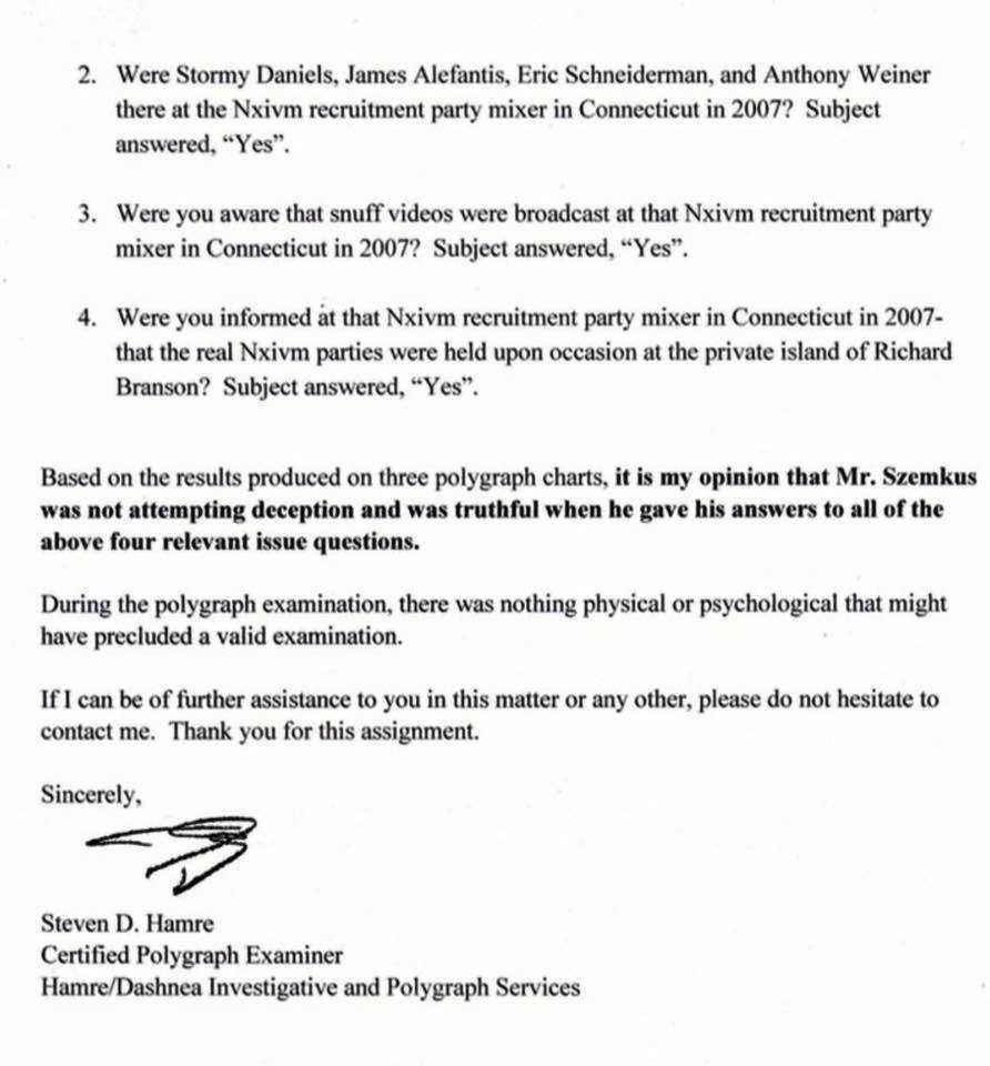 Sorvolo rapidamente perché devo giungere alla novità esplosiva: un testimone a carico, che dice di aver partecipato ad un “evento mondano” per il reclutamento di clienti della setta nel febbraio 2007 ad Hamden (Connecticut), ha fatto i nomi delle persone che ha visto. Questo testimone si chiama Benjamin Szemkus, si è lasciato sottoporre al poligrafo (macchina della verità) ed è stato ritenuto sincero da due periti addetti al poligrafo.