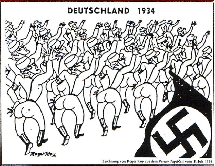 Quel tipo di persone ha una psicologia molto particolare. Negli anni ’30 quasi tutti i primi nazisti in Germania erano così e come tali derisi dalla stampa… QUESTA È UNA VIGNETTA ORIGINALE DEL 1934 PUBBLICATA A PARIGI. RAFFIGURA LE “SA” (SQUADRE DI ASSALTO) NAZISTE, NOTORIAMENTE OMOSESSUALI EFEBOFILI.