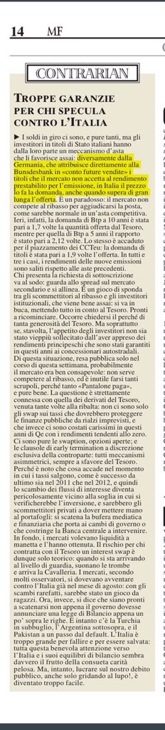 Questo articoletto di Milano Finanza contiene una rivelazione fulminante: la Banca Centrale tedesca non ha fatto il “divorzio” dal Tesoro. Quando emette titoli di debito, la Germania lo fa ad un interesse prestabilito; se “i mercati” vogliono un maggior interesse, il Tesoro conferisce alla sua banca centrale l’invenduto.