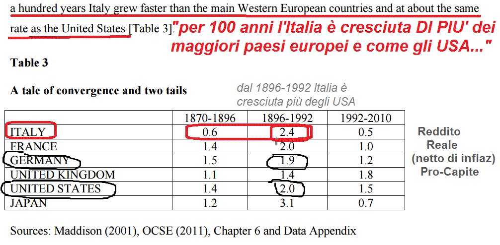 l’Italia ha avuto un periodo di crescita molto peggio degli altri paesi tra 1870 e fine secolo e poi di nuovo dal 1995 circa a oggi. Invece tra il 1896 e il 1992 ad es era la migliore. Come mai ? Perchè quello fu il periodo in cui MONETIZZAVA I DEFICIT….e pagava pochi INTERESSI. Per cento anni l’Italia è cresciuta più degli altri paesi europei.