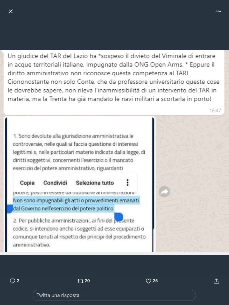 Ora, leggo da un twitter : “Docenti di Diritto Universita ‘BO, FI, PV, RE, MO, PD, PR, MI, VE, TO + altre, sono DISPONIBILI a firmare e guidar #clas_action_contro_TAR_Lazio , per suo intervento NON ammissibile, destabilizzatore Istituzioni repubblicane e procurato Danno Erariale da Obbligo di Sbarco finti Profughi”.