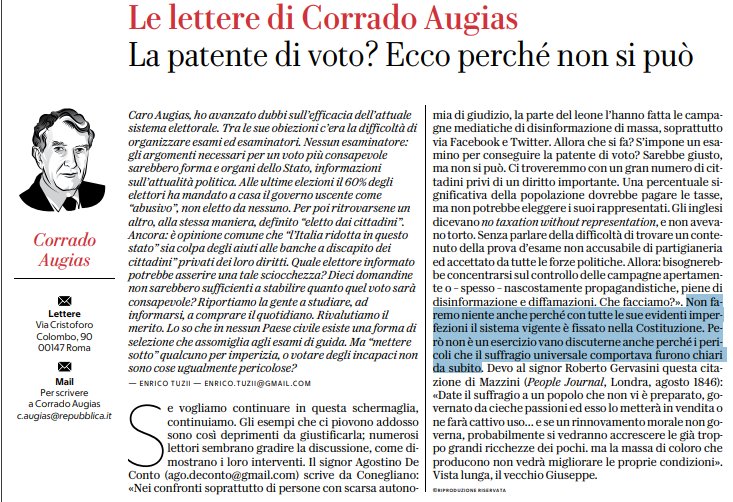 Se sei un importante intellettuale democratico e progressista, come Corrado Augias, puoi augurarti che il diritto di voto venga limitato a chi ha una “patente” , un livello di cultura e informazione, e dal voto siano esclusi gli ignoranti – sottintesi , che hanno votato 5 Stelle e Salvini.