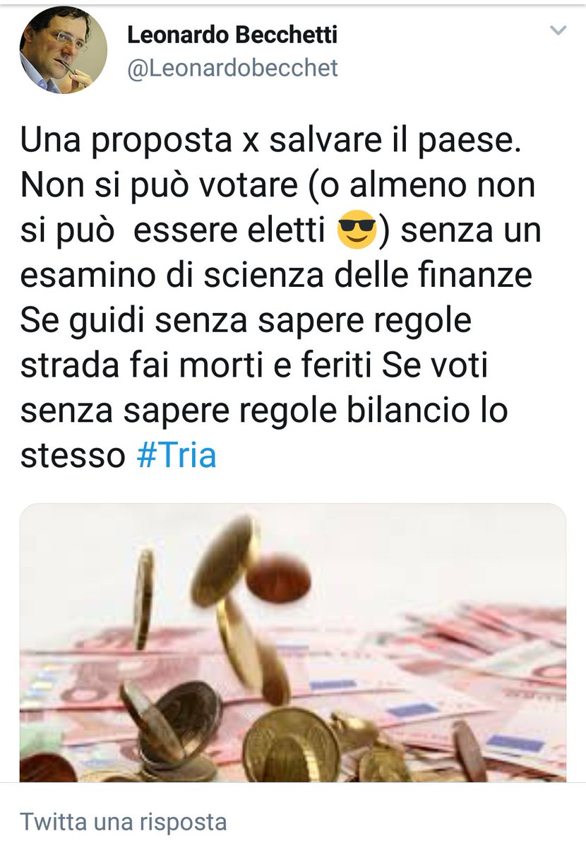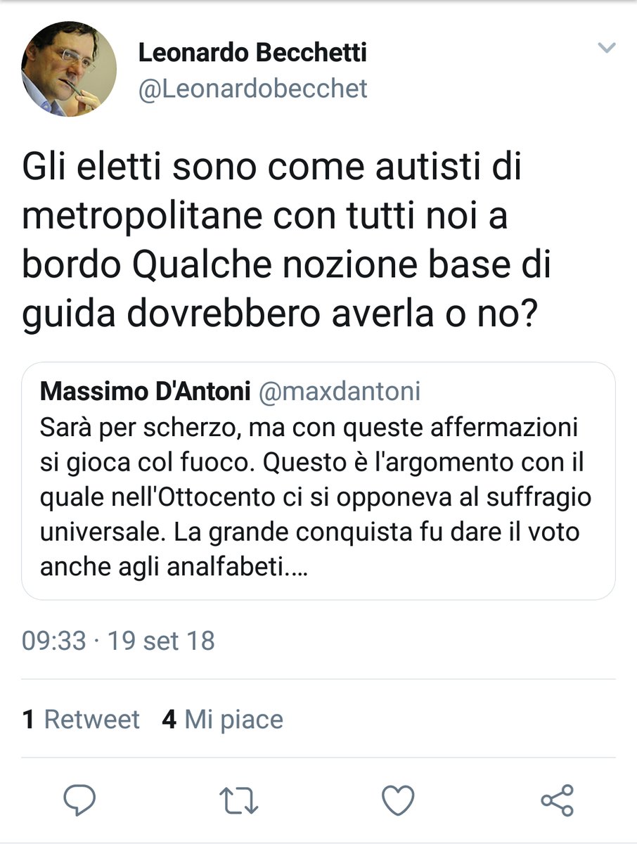 Anche questo Leonardo Becchetti, economista, molto progresista, propone di limitare il diritto elettorale attivo e passivo a chi non ha fatto un esamino di scienza delle finanze. E insiste pure sul tema: solo i competenti hanno diritto di comandare e di votare.