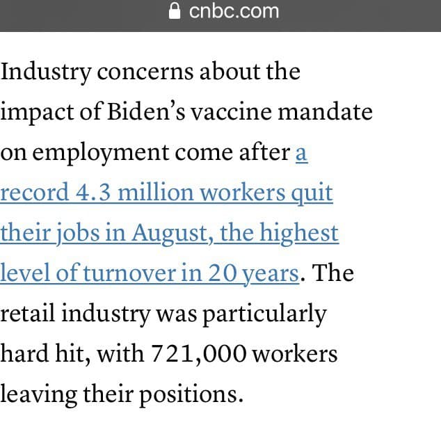 Preoccupazione del settore per l’impatto sul lavoro dell’obbligo di green pass imposto da Biden, dopo che un numero record di 4,3 milioni di addetti ha lasciato il proprio lavoro ad agosto. Il settore del dettaglio è particolarmente colpito, con 721 mila lavoratori che hanno lasciato la loro posizione.V![]()