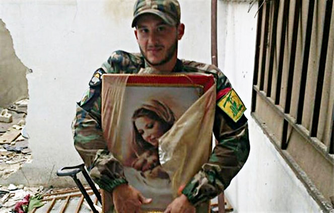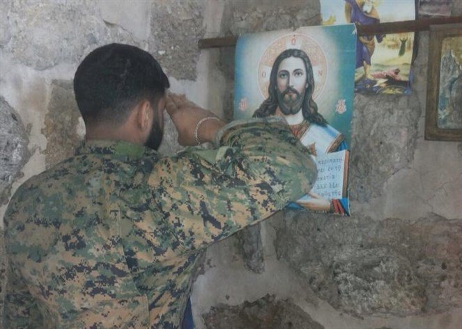 Les photographies ci-dessous montrent le profond respect des combattants du Hezbollah (terroristes selon l’Occident) pour la religion chrétienne et ses icônes, dévastés par l’idéologie wahhabite (alliée précieuse de l’Amérique et de l’Europe).