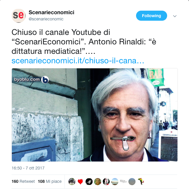 Ora vengo a scoprire che You Tube ha chiuso il canale video di Scenarieconomici.it , il sito di Antonio Rinaldi, un altro esponente del fronte no euro. La colpa? Misteriosa. Nella notifica ricevuta da Rinaldi si parla di “ripetute e gravi violazioni delle regole della community” ma non si precisa quali. Come un vero Grande Fratello, You Tube decide di censurare un canale, vestendo al contempo i panni dell’inquisitore e del giudice. Già perché a vagliare il ricorso presentato da Rinaldi è stata la stessa You Tube, respingendolo ovviamente.