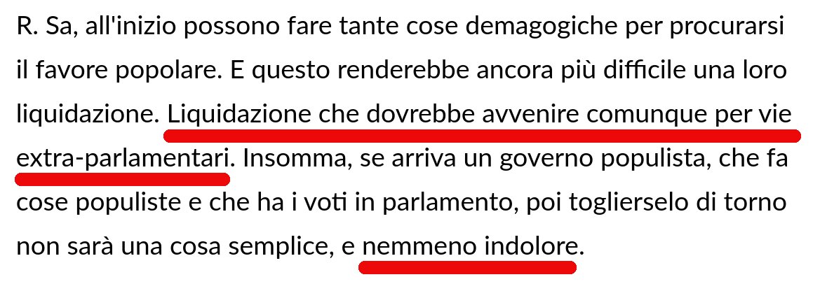 R. Sa, all’inizio possono fare tante cose demagogiche per procurarsi il favore popolare. E questo renderebbe ancora più difficile una loro liquidazione. Liquidazione che dovrebbe avvenire comunque per vie extra-parlamentari. Insomma, se arriva un governo populista, che fa cose populiste e che ha i voti in parlamento, poi toglierselo di torno non sarà una cosa semplice, e nemmeno indolore.