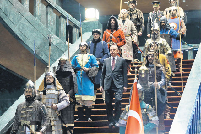 Nel gennaio di quest’anno, quando ha ricevuto il capo palestinese Abbas nel suo sfarzoso palazzo presidenziale, Erdogan lo ha atteso su una scalinata, affiancato da una guardia d’onore di 16 guerrieri in costumi storici, fra cui ce n’era uno in antico costume del kanato degli uiguri.