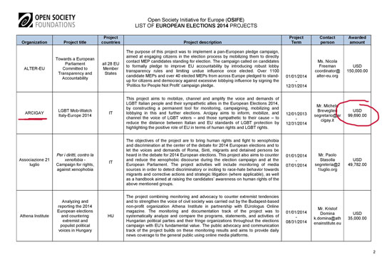 Tra questi, per quanto riguarda l’Italia, l’“Associazione 21 luglio”, un’organizzazione non profit impegnata nella promozione dei diritti umani di rom e sinti su tutto il territorio nazionale, si è vista assegnare la cifra di 49.782 $ per il progetto “Per i diritti, contro la xenofobia”, svoltosi dal 1 gennaio al 1 luglio 2014.
