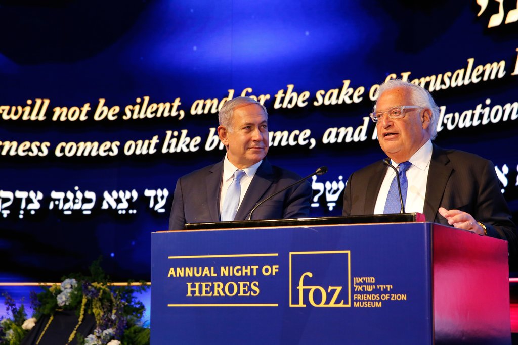 David Friedman , l’ambasciatore USA in Sion, fa la sua dichiarazione sotto lo sguardo compiaciuto di Bibi.