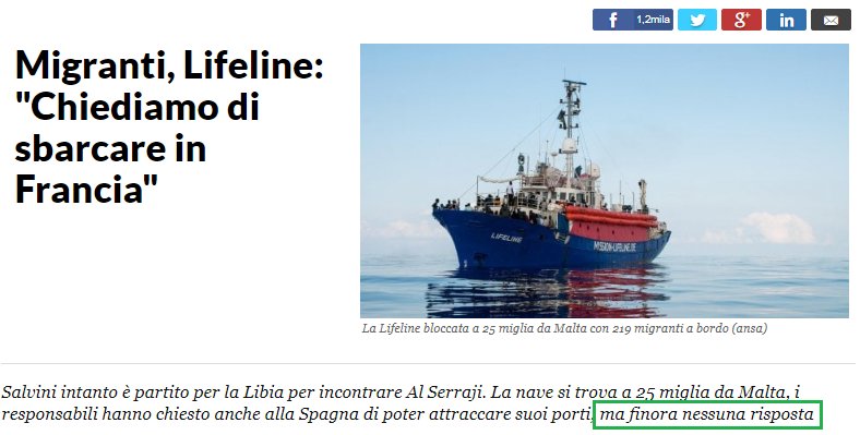 Esemplare il caso della Lifeline, la nave di soccorso che (a trasponder spento) ha raccolto 230 e passa africani dalla Libia, il triplo in più della sua possibilità di soccorso. Prima chiede di sbarcare gli africani alll’Italia, con insistenza, e riceve la risposta: rivolgersi alla Libia. Passano le ore, la Lifeline chiede a Malta: rifiuto.