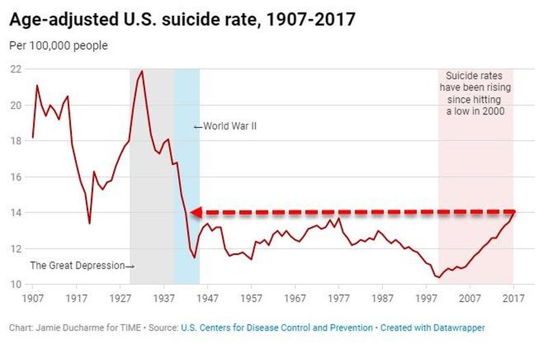 SUICIDI IN AUMENTO NEL MONDO Maurizio Blondet 21 Novembre 2019 0 (Gli uomini molto più delle domme) Durante le guerre, i suicidi calano enormememte.