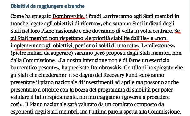 Che è questa: per accedere ai pretesi 82 miliardi “a fondo perduto”, l’Italia deve versare al nascituro Fondo la sua quota di contribuzione: 56 miliardi.
