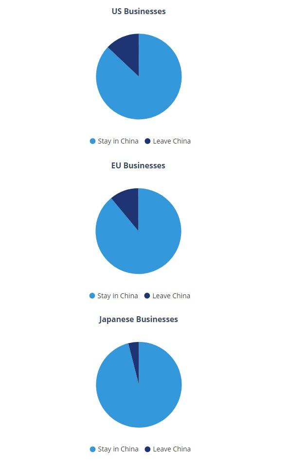 Solo il 13% delle imprese americane ha risposto che la Cina, e l’87% restano. Una percentuale non molto lontana dall’89% delle europee che restano. Ma ancor più indicativa la risposta delle imprese del Giappone: che vede la Cina come non solo il concorrente ma il nemico storico, che sta diventando enormemente potente.