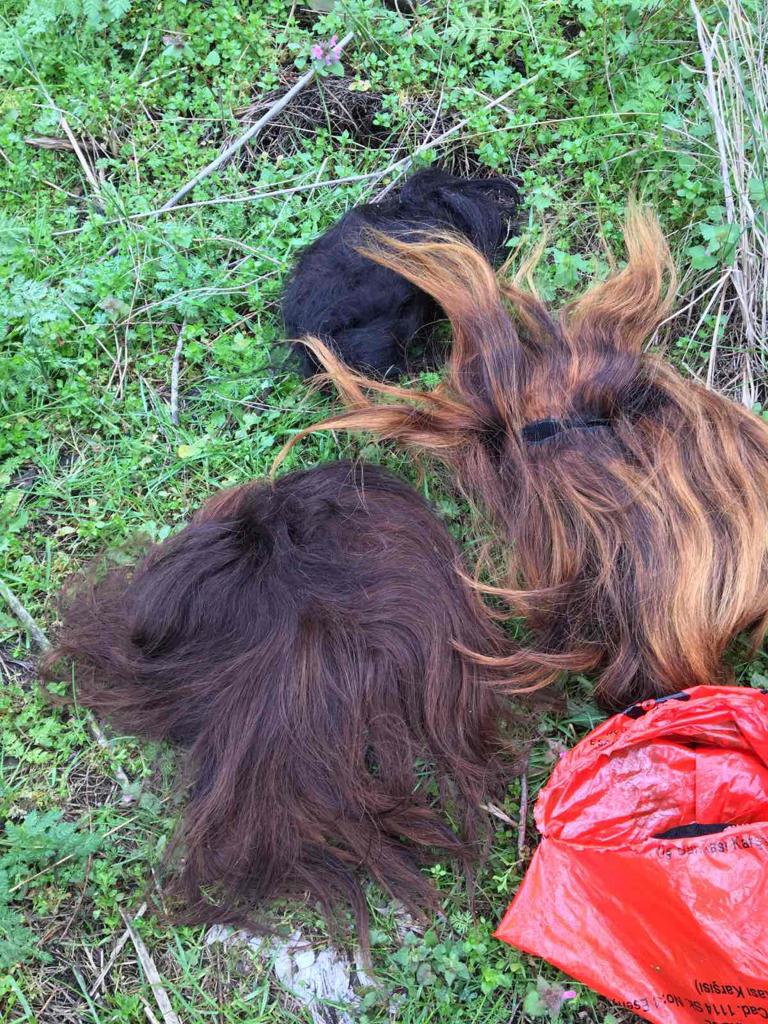Qui ecco alcune parrucche lasciate dai “profughi” per passare per donne nelle scene di guerriglia, a beneficio di telecamere progressiste. Essendo in realtà visibilmente maschi in età militare.