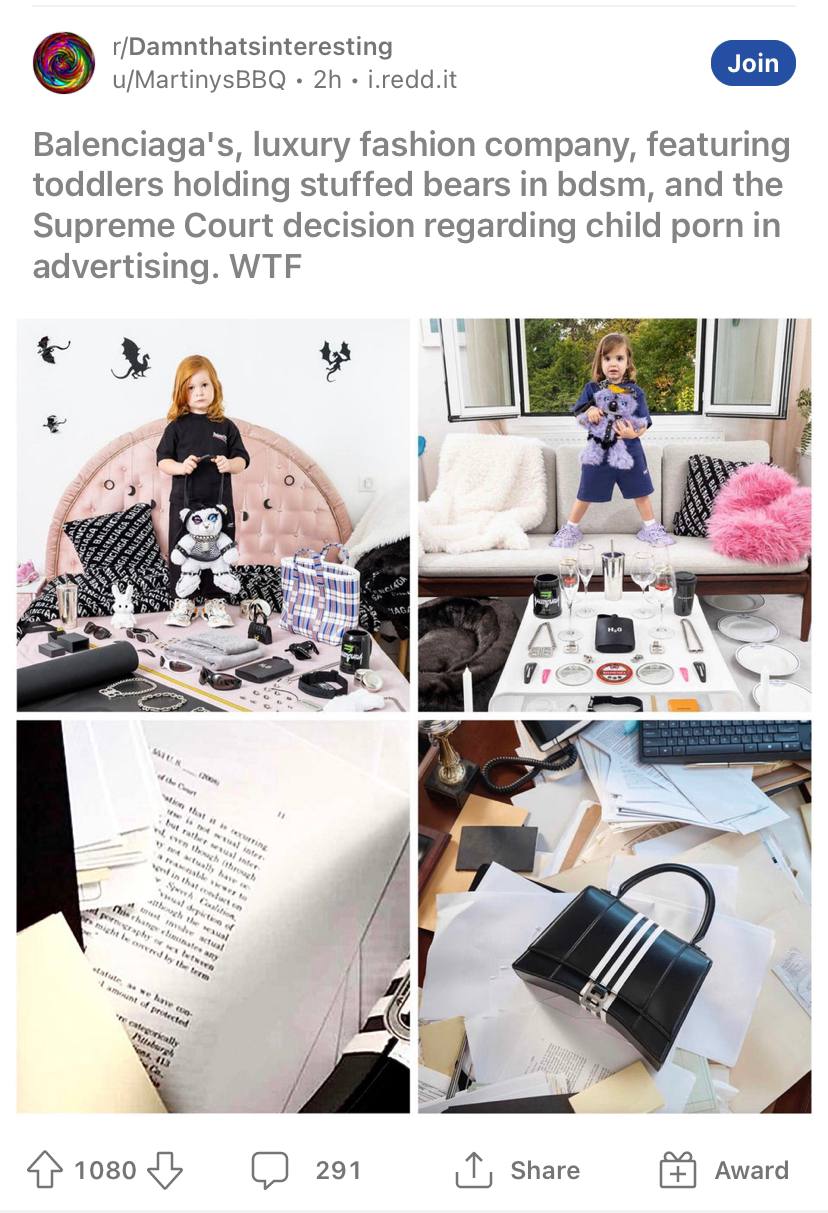 Ha fatto rumore la campagna pubblicitaria di Balenciaga che mostrava dei bambini che tenevano in braccio degli orsacchiotti vestiti con catene di cuoio kink e bondage, ed allusioni (evocazioni?) al mondo satanista e pedofilo. A sinistra in basso, in una foto della campagna pubblicitaria, una decisione della Corte Suprema degli Stati Uniti sul divieto della pornografia infantile nella pubblicità; a destra in basso, la sentenza semi-nascosta da una borsa di Balenciaga.