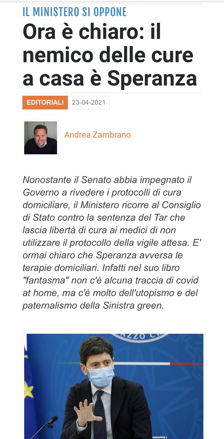 “Questo atteggiamento non può non essere una precisa strategia politica del governo Draghi che ha confermato pubblicamente la sua fiducia a Speranza, non può che essere il risultato di una programmazione che vede nella cura precoce del Covid un ostacolo al raggiungimento di certi scopi. Quali? Sicuramente il vaccino che deve essere il primo e unico obiettivo delle attuali politiche sanitarie.