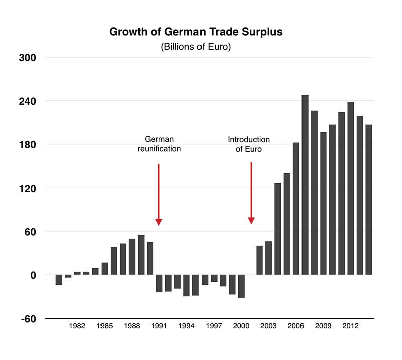 “La Germania guadagna un massiccio 46 per cento del suo prodotto interno loro dalle esportazioni, molto ma molto più di ogni altra grande economia”.