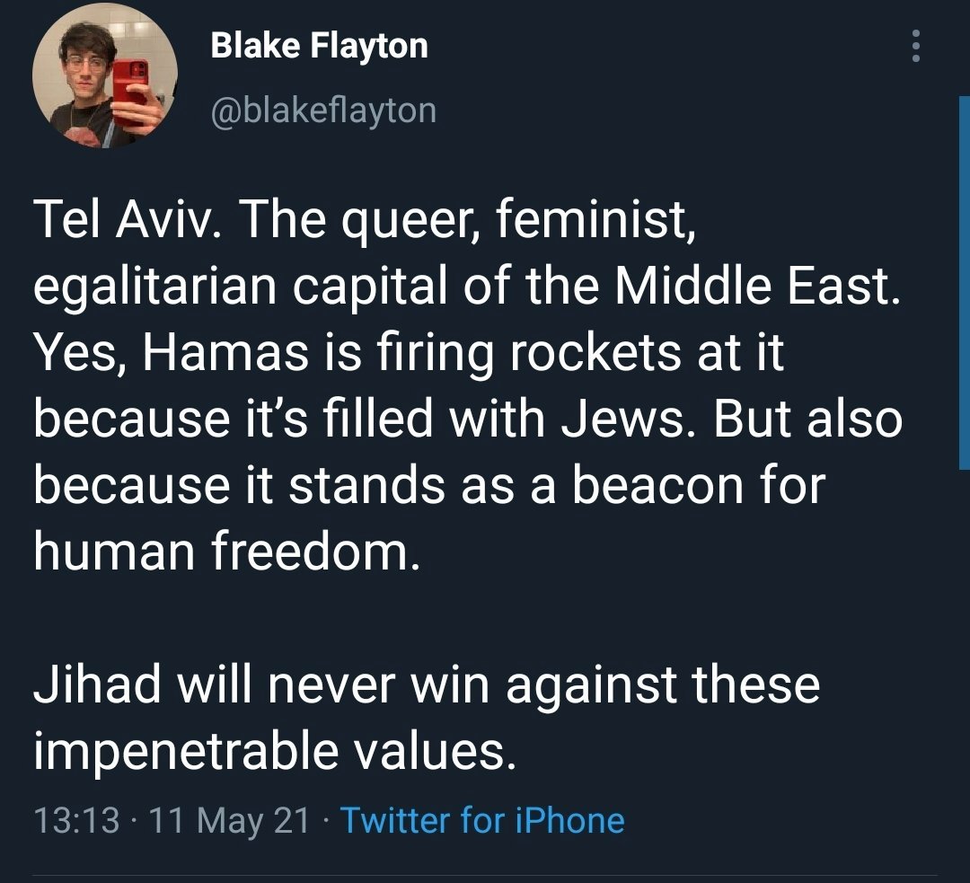 “HAmas colpisce Tel Aviv, la capitale gay, femminista, libertaria, perché è un faro della libertà. Il Jihad non vincerà contro questi impenetrabili (sic) valori!