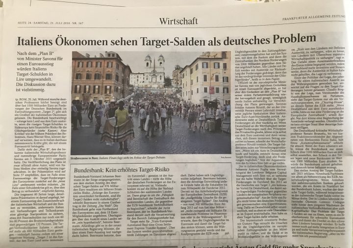 Sabato 21 luglio scorso a pag.24 la prestigiosa testata tedesca Frankfurter Allgemeine Zeitung ha dedicato un editoriale a cura di Tobias Piller sull’unione monetaria europea e in particolare sul tema dei saldi Target 2 prendendo spunto dalle teorie sostenute dall’economista Hanns-Werner Sinn ex direttore dell’Istituto IFO. Fra le opinioni a riguardo Il sottoscritto, invitato a rispondere sull’argomento, ha risposto nel seguente modo: