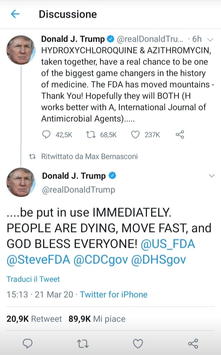 Il punto è che l’incolpevole ed apolitica idrossiclorochina è stata indicata da Trump, il 19 marzo, come un farmaco utile contro il Cov-19. Tutti – ma proprio tutti – i media televisivi sono saltati alla gola del presidente: ignorante! Rozzo! Cosa ne sai!, ascoltiamo invece il prof. dott Anthony Fauci che è competente! Sono state organizzate trasmissioni per dimostrare che Trump difendeva la clorochina perché detentore di azioni Sanofi, la presunta casa produttrice. Per poi scoprire che Donald ha azioni della Sanofi per 435 $. Nessuno scandalo ha suscitato il fatto che il numero 2 dell’OMS, Bruce Aylward, abbia rumorosamente raccomandato il Redemsivir (il 24 febbraio), senza attendere i risultati dei test, prendendo apertamente le parti per la Gilead che aveva giustappunto brevettato il farmaco. Nessuna curiosità sulla mazzetta probabilmente percepita dall’esperto?