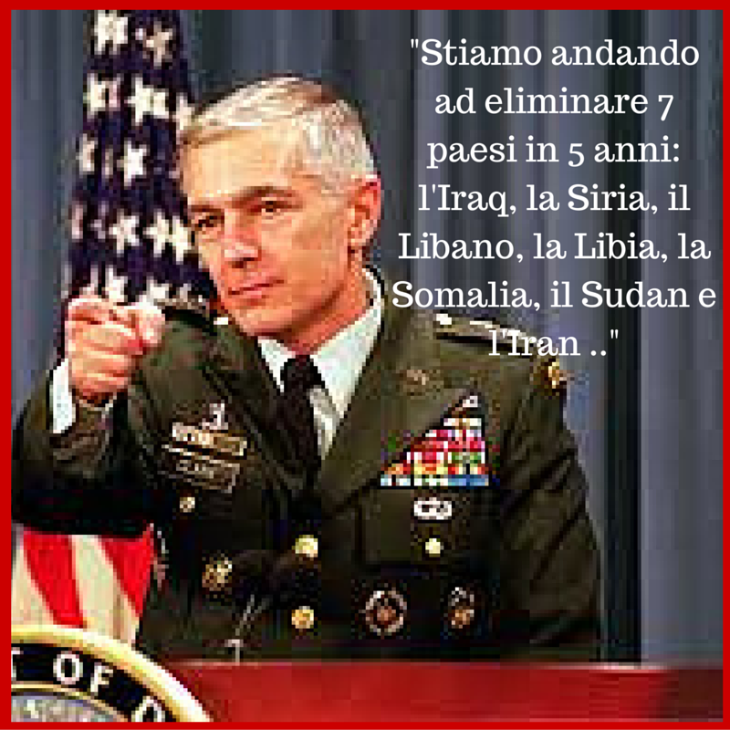 Ricordiamo che nel 2007, alla CNN, mica ad un blog complottista, il generale Wesley Clark, già capo delle forze NATO contro la Serbia, racconto: il giorno dopo l’11 settembre (lui era appena andato in pensione) andò al Pentagono per parlare coi vecchi colleghi del mega-attentato. Uno dei generali che era appena sceso dagli uffici del ministro (Rumsfeld), impressionato, gli sussurrò: “adesso attacchiamo l’Irak. Vogliono attaccare 7 paesi in 5 anni: cominciamo con l’Irak, poi Siria, Libano, Libia, Somalia, Sudan e infine l’Iran”.