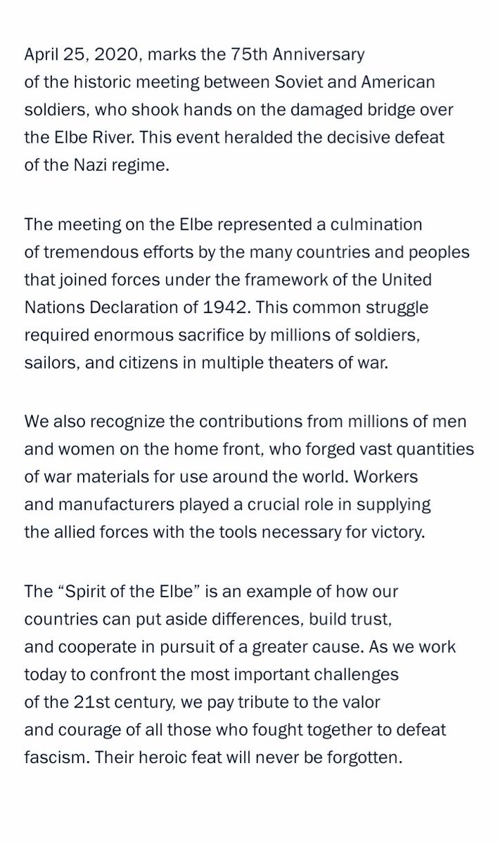 #Putin e #Trump firmano, e postano sui rispettivi siti, una dichiarazione congiunta sullo “spirito dell’Elba”, per ricordare l’incontro dei due eserciti sull’Elba il 25 aprile 1945. Quello storico incontro fra le truppe statunitensi e sovietiche sul punto di debellare la Germania nazista “come esempio di come i loro paesi possono cooperare”.