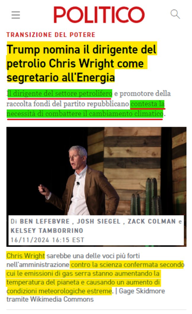 E dopo Kennedy alla Salute, Trump sferra un altro duro colpo al deep state che potrebbe mettere i chiodi sulla bara del Finto Green: nomina come segretario all’ Energia il petroliere Chris Wright