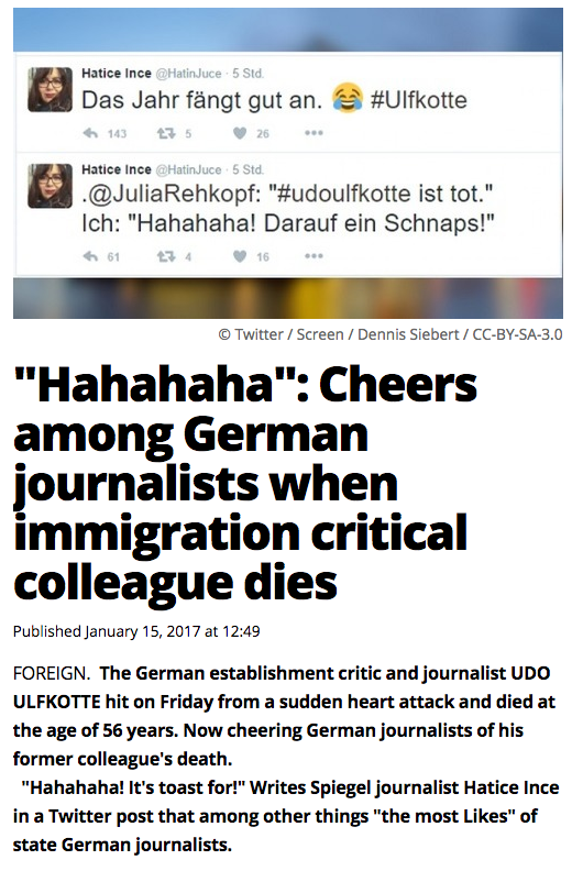 Effettivamente, quando si cercano informazioni sul web su temi seriamente critici di Angela, non viene fuori praticamente nulla. “Not Found”; “Error”, eccetera. Dicono che Ulfkotte avesse già avuto tre infarti. Fatto sta che trovo questa notizia: “Ahahahah! Esultanza fra i gironalisti tedeschi per la morte del loro collega critico dell’immigrazione”. “Udo Ulfkotte è morto! Brindiamo!”