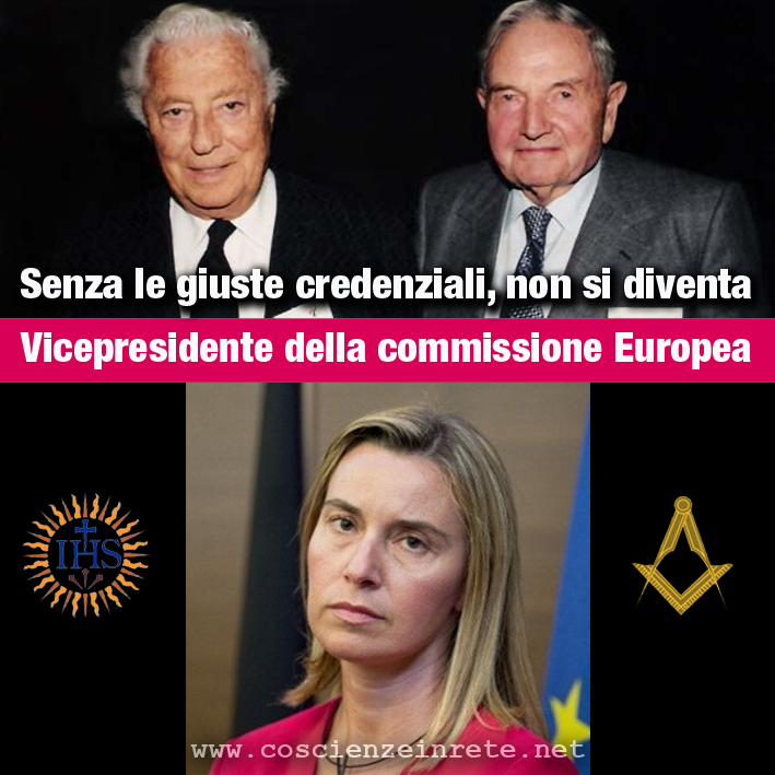Che la UE sia qualcosa di diverso dall’Alleanza Atlantica non passa nemmeno per la zucca della Mogherini. Del resto il sito Coscienza in Rete ha ben spiegato chi è: parente di Veltroni, socia dello IAI (Istituto Affari Internazionali), dove si trova “ crema della trasversalità gesuito-massonica italiana, dal presidente onorario (Carlo Azeglio Ciampi) a Saccomanni, da Scognamiglio ad Andreatta, ecc.” (io direi globalista-massonica), er in più mmembro del l Consiglio per le relazioni tra Italia e Stati Uniti (CONSIUSA) è stato fondato nel 1983 da Gianni Agnelli e David Rockefeller, e le sue attività avvengono in stretto rapporto con la Loyola University of Chicago. Non è difficile, visto il nome, indovinare a chi appartenga la Loyola University, (..). In ogni caso, il CONSIUSA contava come vice-direttore, fino a non molto tempo fa, un personaggino come il banchiere massone Robert Agostinelli..”: Insomma la Mogherini è una allevate per servire agli interessi globalisti. Finirà che il Time le dedicherà la copertina come donna dell’Anno.