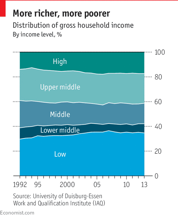 E’ per questo che, nella gabbia della crescita insufficiente permanente, gli Stati abbandonano a sé stessi pezzi interi di territorio – come in una inedita forma di latifondismo da capitalismo finanziario – mentre la ricchezza si concentra nelle zone già ricche, che diventano più ricche mentre i poveri diventano più poveri: è ciò che vediamo nel Mezzogiorno d’Italia abbandonato, e che i francesi vedono nella “France péripherique” dei villaggi senza servizi medici, distributori né supermercati , oggi in rivolta. Anche nella ricca Germania il successo economico ha arricchito una piccola minoranza, mentre i tedeschi in generale si impoveriscono. E addirittura 1,5 milioni di tedeschi si affidano per mangiare alle banche del cibo, a cui i supermercati conferiscono gli alimentari invenduti e in scadenza.