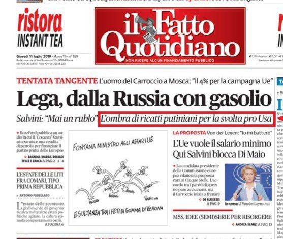 Un motivo in più per screditare la panzana e chi l’a diffonde (i media italioti all’unisono) è : pensate che l’ENI si metta al servizio di Savoini e della Lega per impapocchiare un commercio petrolifero con tangenti? ENI è uno Stato, ha i suoi servizi, ha i suoi contatti. Se vuole fare le cose, sa quali russi contattare – senza che Nardelli lo sappia.