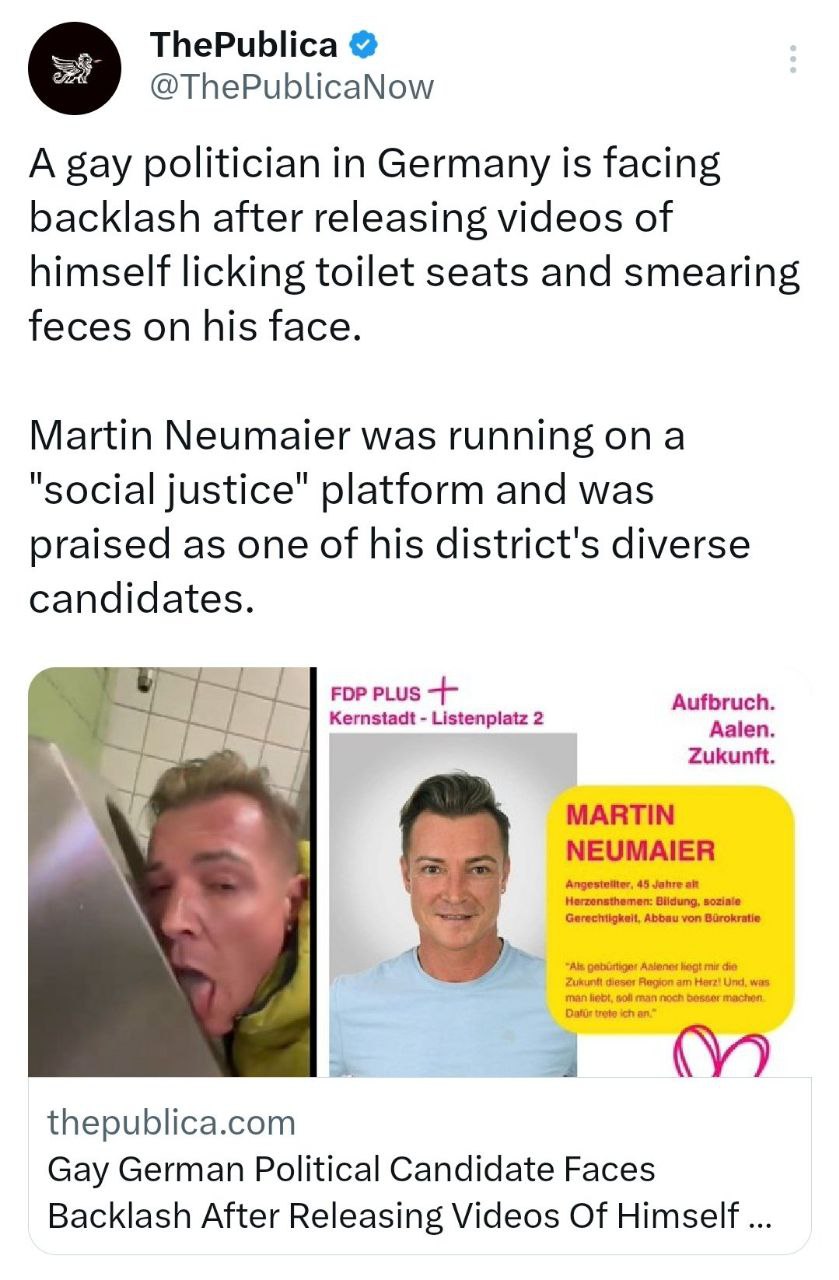 Martin Neumaier, un politico gay tedesco, ha pubblicato dei video in cui leccava le tavolette di cessi pubblici, cantava l’inno tedesco mentre si infilava un vibratore nel culo o si spalmava il viso di merda.