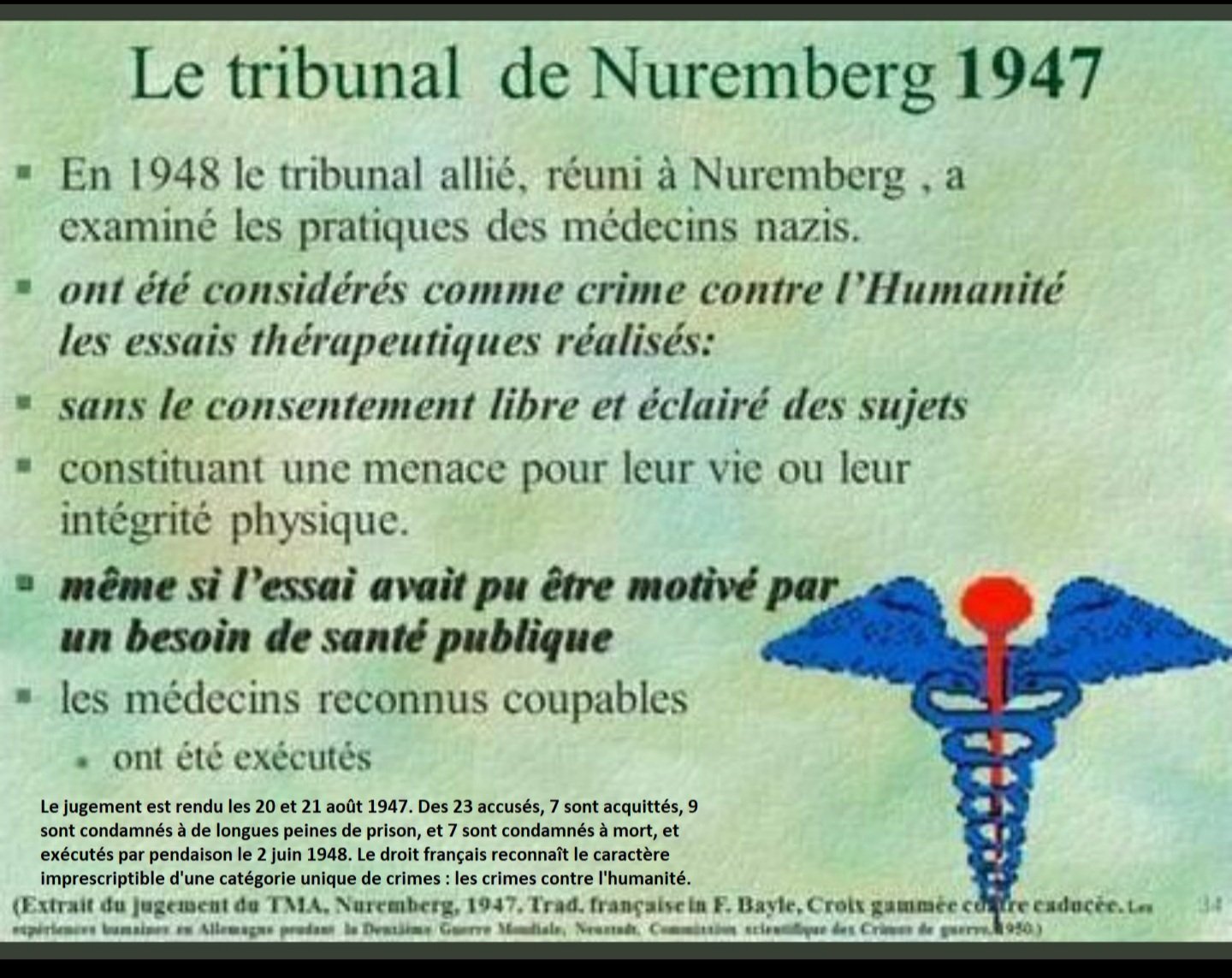 Tra l’altro il processo di Norimberga 1.0, nel 1947, giudicò l’esatto caso: dichiarò colpevoli di crimini contro l’umanità i medici che avevano condotto test terapeutici senza il consenso informato dei pazienti, che avessero portato minaccia alla loro vita o integrità fisica, anche se potevano essere mossi da motivazioni di salute pubblica. I medici condannati subirono le pena capitale.