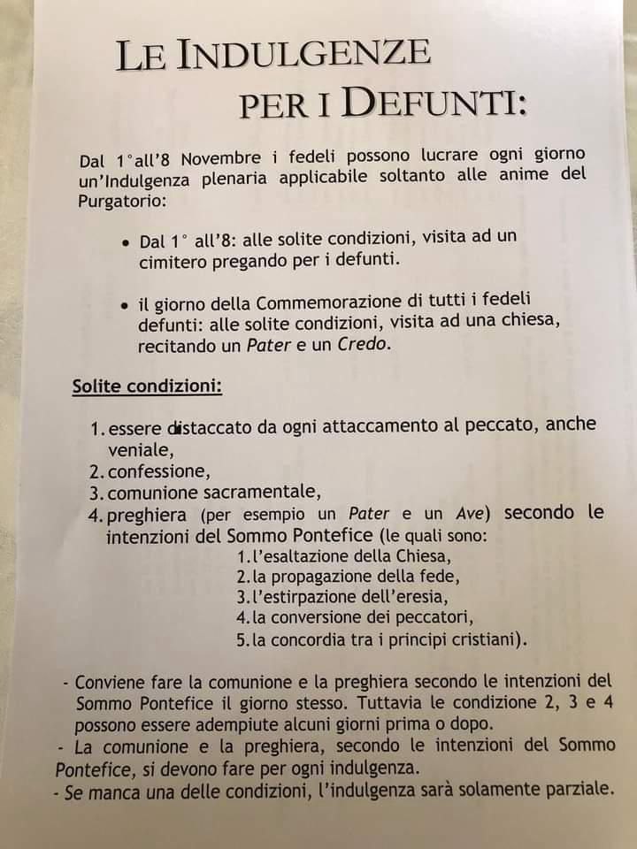 Consiglio: Per evitare il rischio di lasciare le cose a metà, si consiglia di andare alla Santa Messa vespertina (cioè pomeridiana) del 1° Novembre oppure ad una delle S. Messe del 2° Novembre. Quando sei in Chiesa per la S. Messa, confessati, fai la Santa Comunione, recita le citate preghiere. A quel punto l’indulgenza è lucrata ed un vostro caro defunto esploderà di gioia perché gli avete appena concesso la possibilità di lasciare il Purgatorio ed entrare in Paradiso.